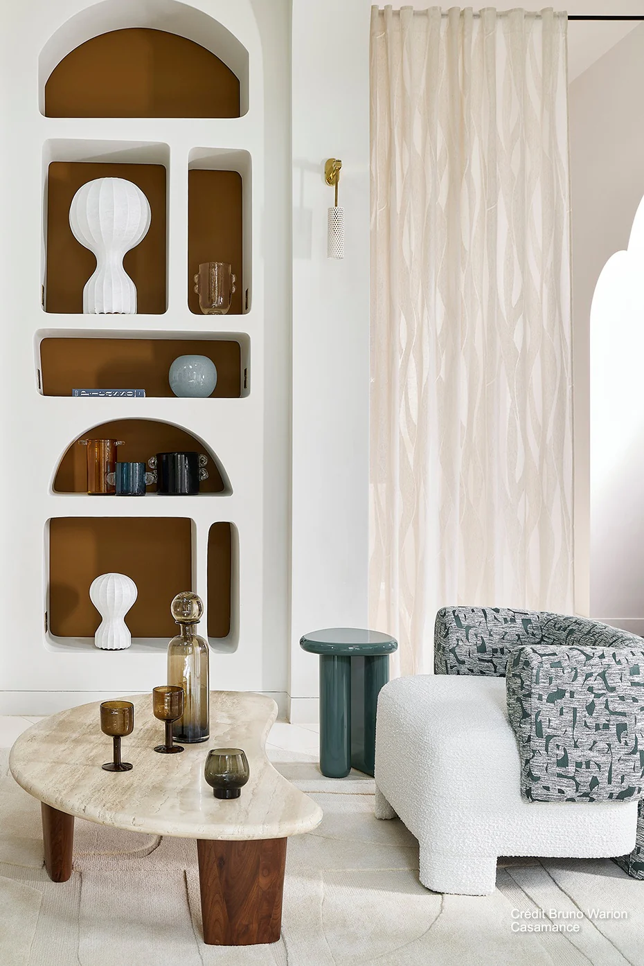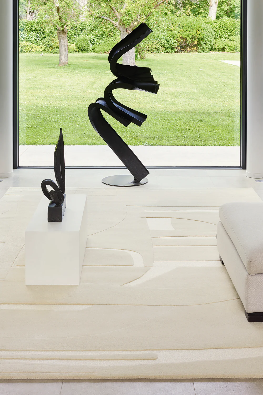 The iconic hand-tufted white wool rug, created by Pascale Risbourg, reveals a subtle harmony of reliefs and textures, creating a sophisticated shadow effect that highlights its soft and delicate nuances. Every element of this rug has been meticulously thought out and executed, from the selection of wool to the art of hand tufting. Wool, a naturally robust and soft material, provides a feeling of warmth and well-being under your feet. The manual tufting process guarantees remarkable quality and longevity, making this rug a long-lasting choice for your home.