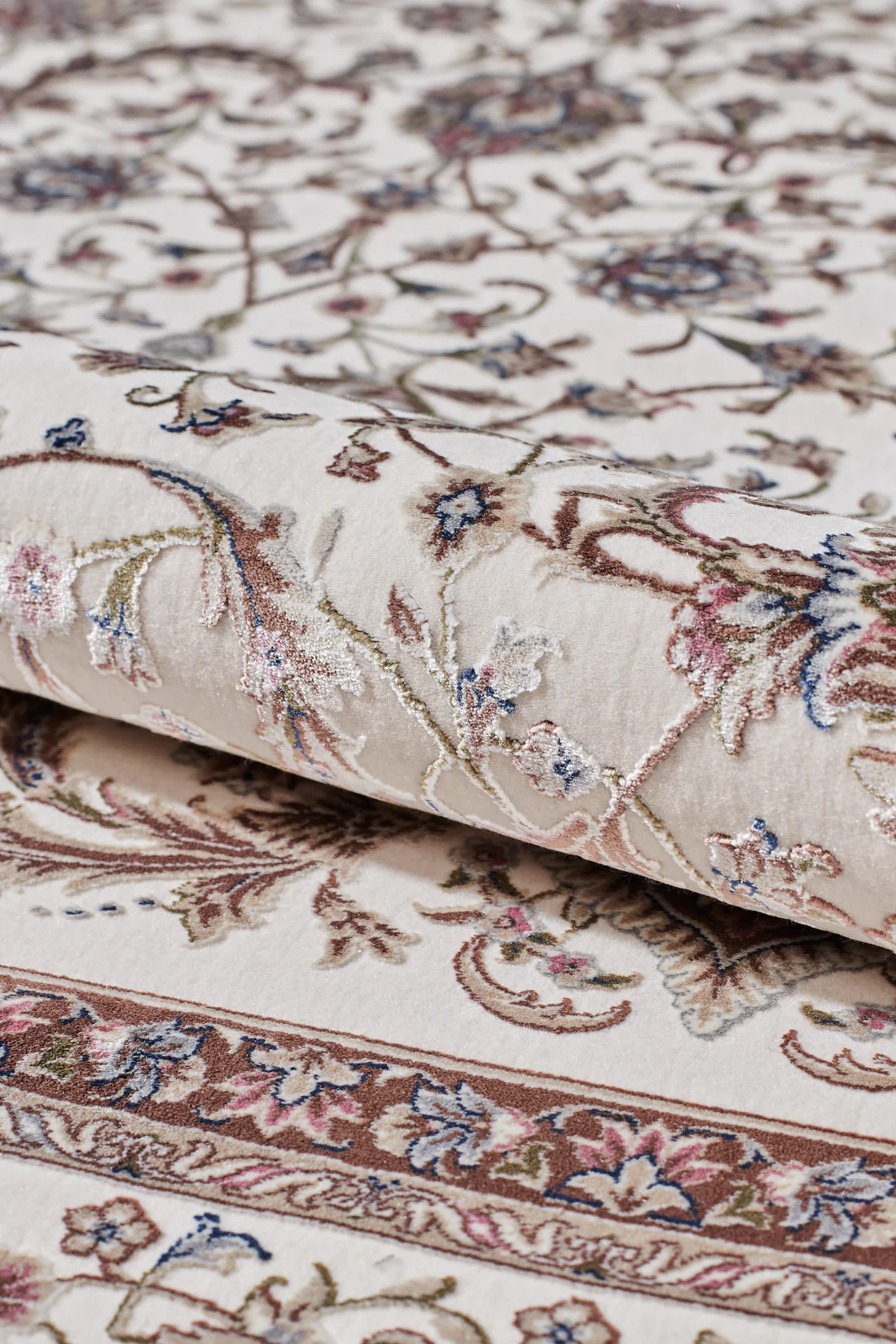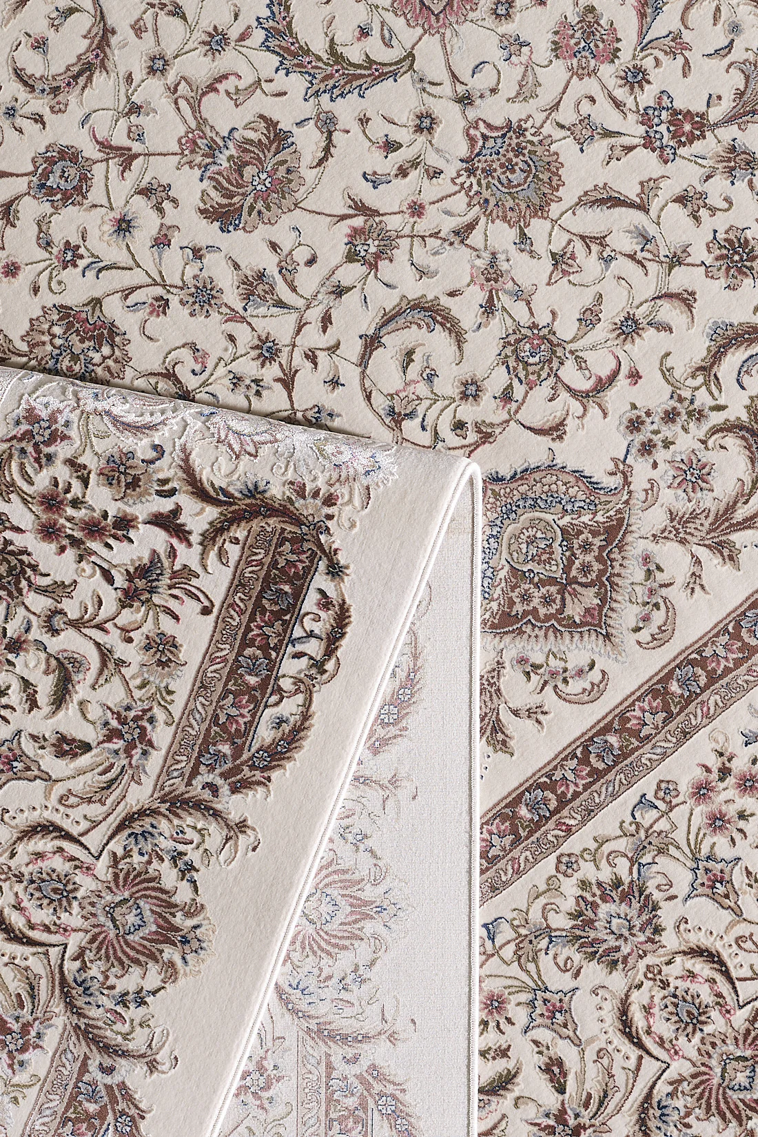 See vaip kujutab endast kreemikate ja beežide toonide õrna koosmõju, mis on kujundatud keerukaks lillemustriks, millest õhkub klassikalist elegantsi. Õite ja lehestiku tihedat massiivi raamib sama üksikasjalik ääris, mis suurendab kujunduse üldist rikkalikkust. See tükk tähistab traditsioonilist vaipade valmistamist, pakkudes luksuse ja rafineerituse tunnet, mis võib tõsta mis tahes sisekujundusskeemi keerukust.