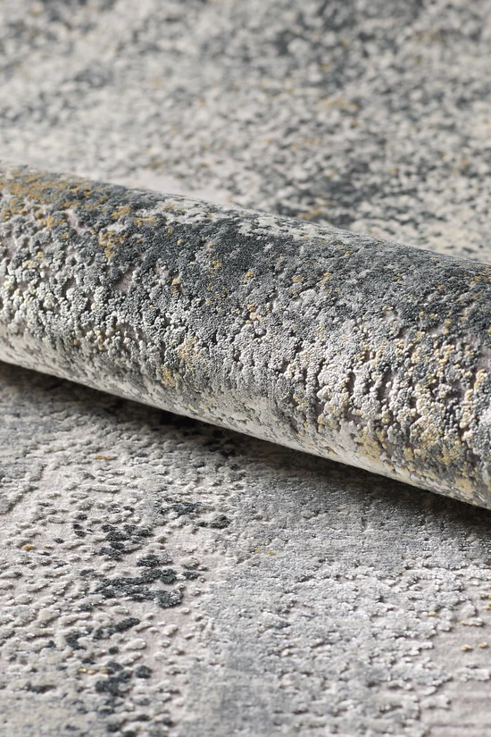 See vaip näitab harmoonilist segu kulunud tekstuuridest ja metallilise läike vihjest, luues rikkaliku kihi visuaalset huvi, mis on nii kaasaegne kui ka kutsuv. Vaiba disain, mis meenutab meisterlikult teostatud lõuendit, ühendab kaasaegse kunsti ja funktsionaalse kodudekori, muutes selle teie eluruumi ainulaadseks statement-tükiks.