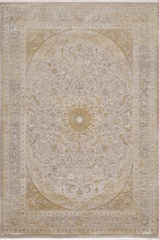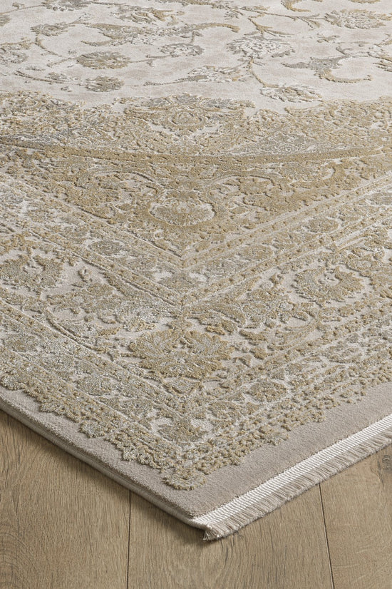 See vaip kaunistab põrandat möödunud ajastu suurejoonelisusega, esitades luksusliku keskmedaljoni, mida ümbritsevad keerukad lillemotiivid ja kontrastne äärekaitse. Kui valgus mängib selle pinnal, kutsub vaiba hõbedane läige ja õrnad kreemikad aktsendid lähemalt uurima.