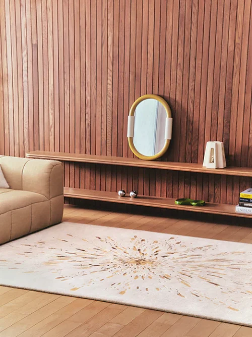 Käsitsi tufting tehnika näitab siin oma täielikku keerukust. Meie meistrid töötlevad iga värvilist ala eraldi, austades erinevaid tihedusi, et luua need reljeefsed efektid, mis äratavad geomeetrilise kompositsiooni ellu. See lähenemine nõuab märkimisväärset tehnilist oskusteavet.