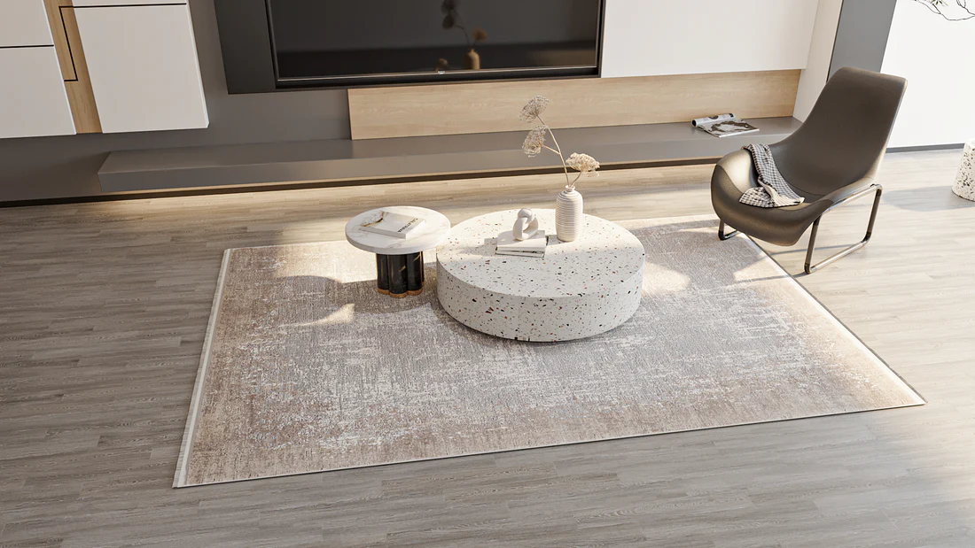 See vaip uhkeldab kaasaegse esteetikaga, millel on kulunud tekstuur, mis annab sellele dünaamilise, elava tunde. Selle summutatud palett kreemidest ja hallidest, mis on läbipõimunud sügavamate toonidega, toob kaasa linna rafineerituse elemendi.